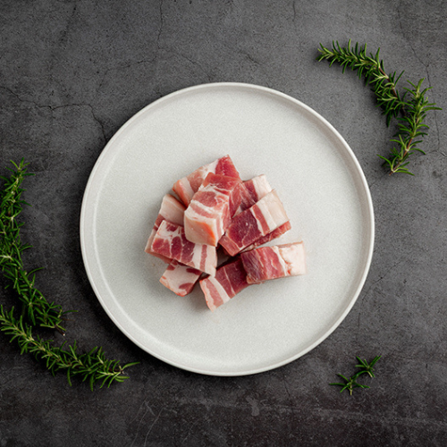 嚴選附皮五花切成2.5*2.5公分的肉塊,