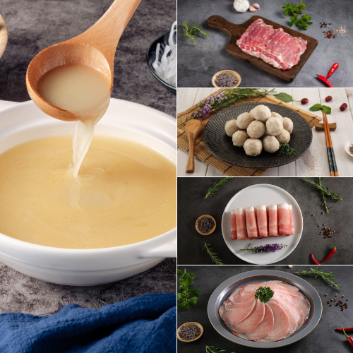 組合內含:雞濃白湯鍋*1、梅花肉片*1、里肌肉片*1、大雪花肉捲片*1、肉丸子*1